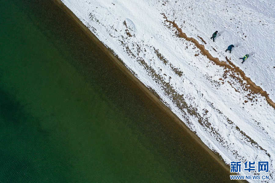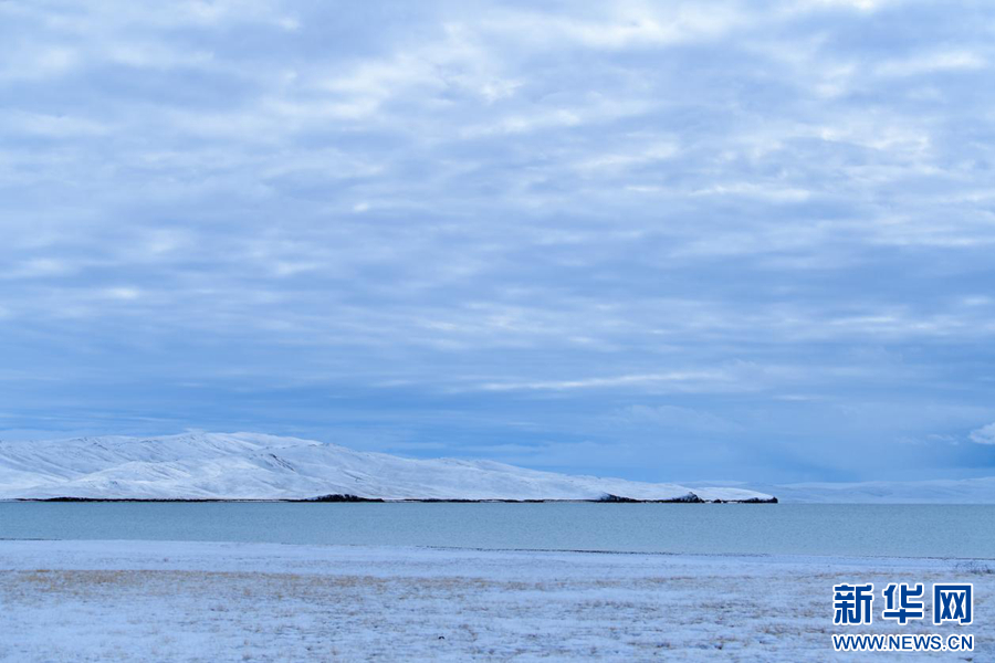 灰蒙蒙的湖泊在积雪的映衬下更加神秘壮观